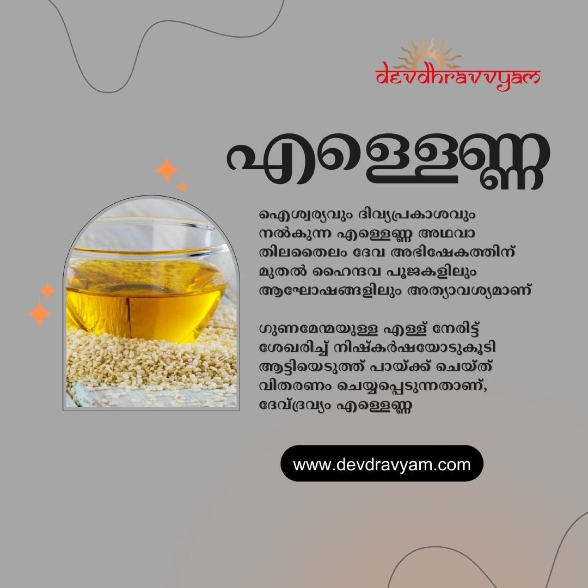 ഐശ്വര്യവും ദിവ്യപ്രകാശവും നൽകുന്ന എള്ളെണ്ണ അഥവാ തിലതൈലം ദേവന് ആടുന്നതിനും അഭിഷേകത്തിനും ഹൈന്ദവ പൂജകളിലും അത്യാവശ്യമാണ്. ഗുണമേന്മയുള്ള എള്ള് നേരിട്ട് ശേഖരിച്ച് നിഷ്കർഷയോടുകൂടി ആട്ടിയെടുത്ത് ഉൽപാദിപ്പിക്കുന്നതാണ് ദേവ്ദ്രവ്യം എള്ളെണ്ണ.